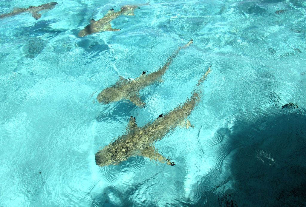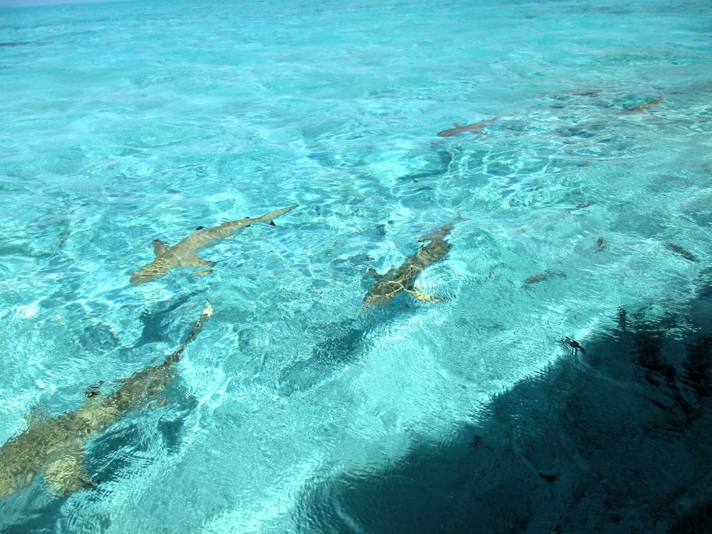 Beim ersten Haltepunkt tummeln sich, angelockt vom Futter der Guides, Haie – genauer Schwarzspitenriffhaie – und Stachelrochen im Wasser. Der nächste Haltepunkt ist an einem Riff in etwas tieferen Wasser, hier gibt es eine tolle bunte Welt der Fische, allerdings ohne Rochen und Haie.