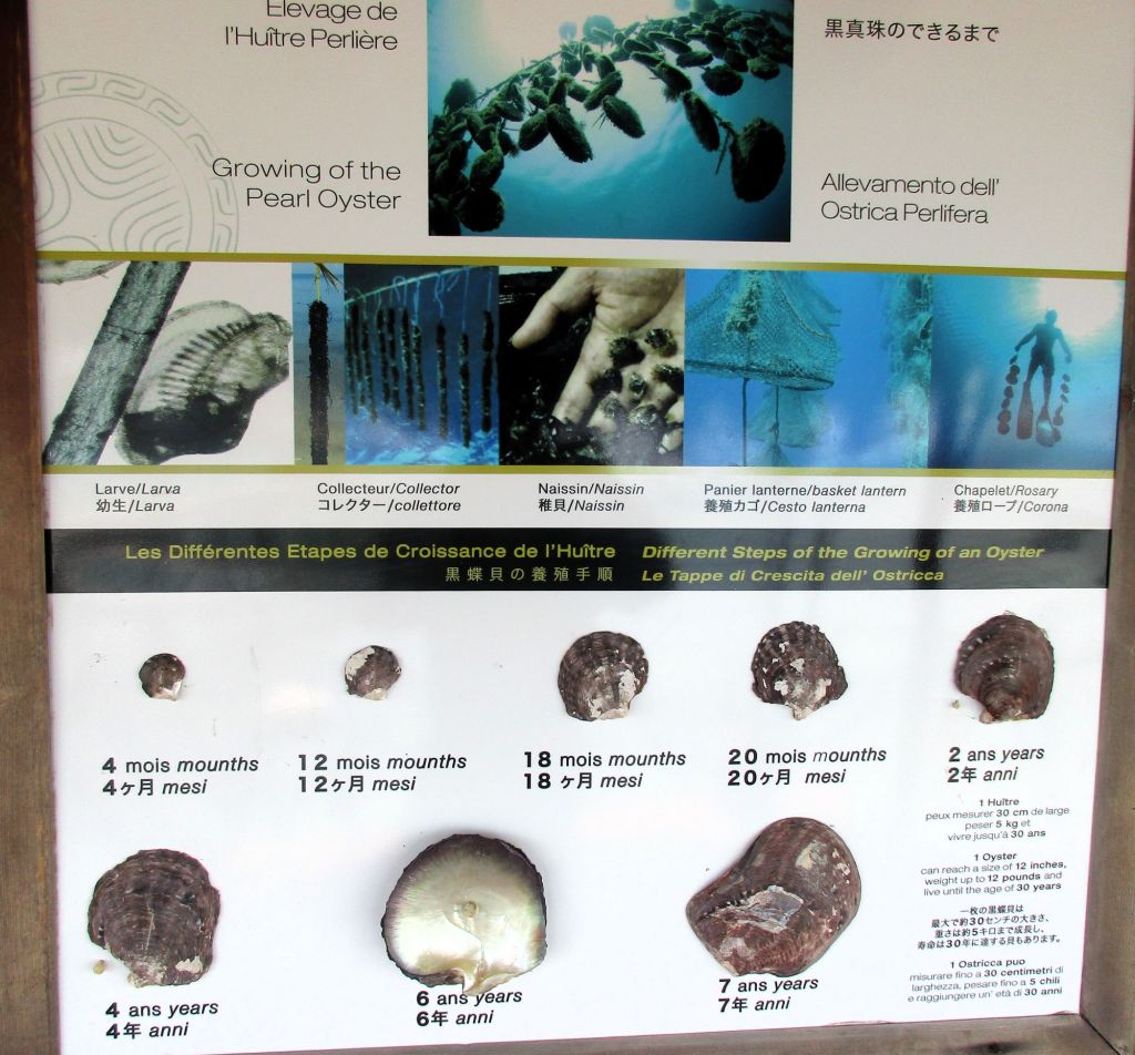 Wir laufen weiter zur Perlenfarm The Farm, die wir gleich in der Nähe gesehen haben. Dort wird sehr gut beschrieben, wie die Perlenzucht funktioniert. Faszinierend, dass ausgerechnet eine Süßwassermuschel aus dem Missisippi als Basis für die Tahitiperle diente.
