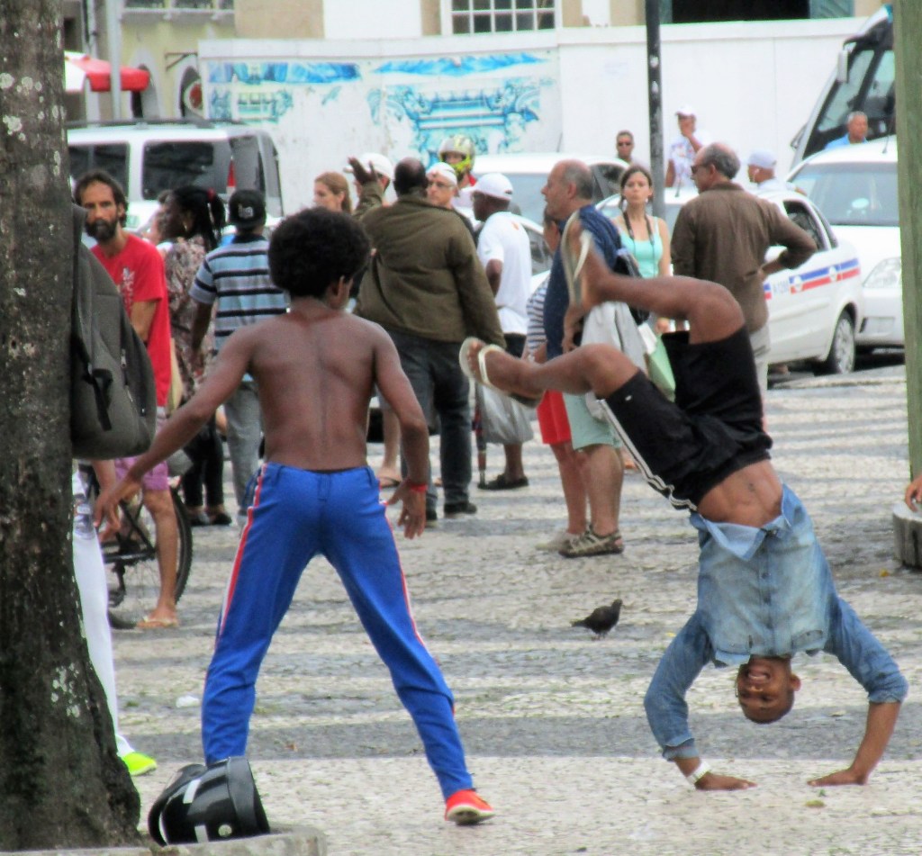 Auf den Plätzen, z.B. Terreiro de Jesus tanzen schwarze Jugendliche den brasilianischen Kampftanz Capoeira.