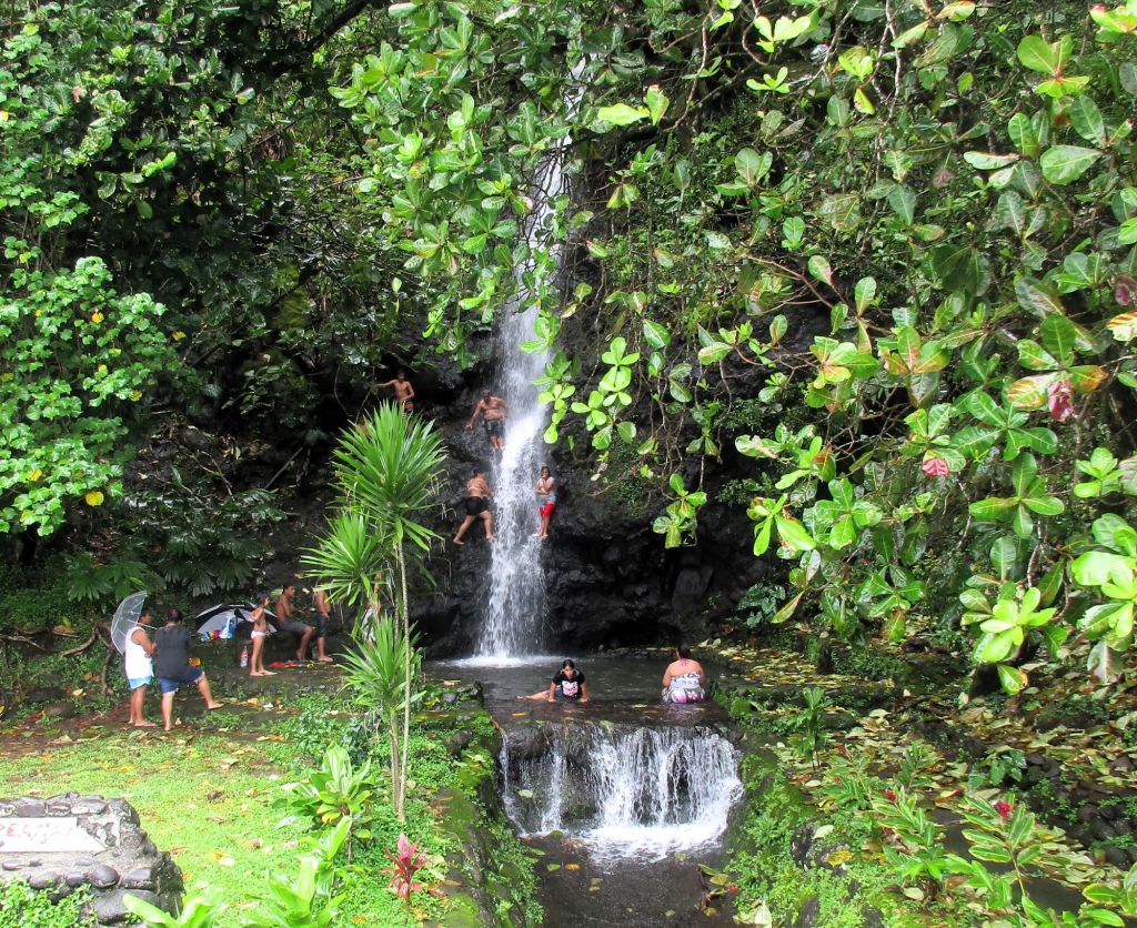 Die Tahitianer scheinen sich am Sonntag mit Vorliebe in den Bächen und Wasserfällen zu baden. Unterwegs sehen wir einige Familien.