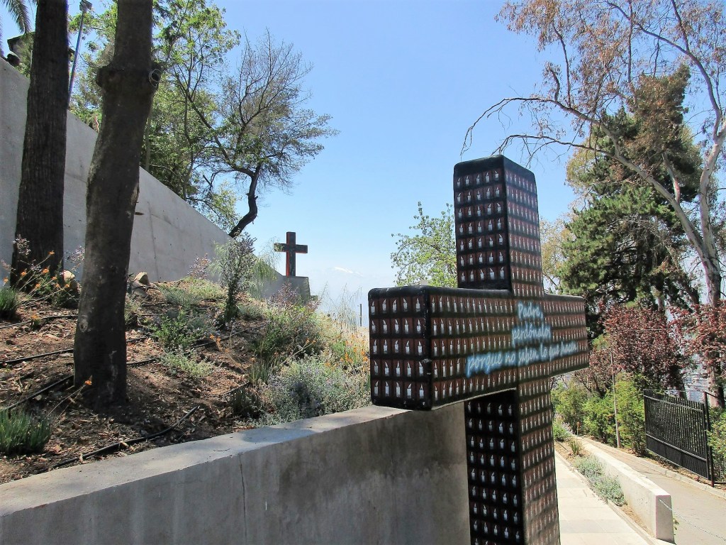 Dort angekommen, organisieren wir uns von der Haltestelle eines Hop-On-Busses eine Citi-Map und können uns nun orientieren. Wir laufen zum Cerro San Christobal auf dem eine 22 Meter hohe Madonna Virgen de la Inmaculada Concepción steht. Wir verzichten auf die Bergbahn und laufen circa 1,5 Stunden die Straße hoch, die eine wunderschöne Aussicht auf die Stadt bietet. Auf dem Gipfel erwartet uns spirituelle Stimmung in der Open-Air-Kirche, die von der sehr schönen Madonna von Ettore Ferrari überragt wird. Hinunter nehmen wir für 1.500 chil$ (ca. 2 € je Person). Hoch und runter hätte es zwar nur 2.000 chil$ gekostet, aber man verpasst die traumhafte Aussicht beim Aufstieg auf die von schneebedeckten Bergen umrahmte Stadt.